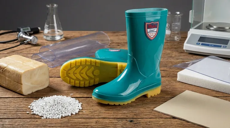 I materiali principali per gli stivali da pioggia sono la gomma naturale, la gomma sintetica, il cloruro di polivinile (PVC) e l'etilene vinil acetato (EVA). Mentre gli stivali tradizionali si basano sull'impermeabilità naturale della gomma, la produzione moderna ha introdotto una gamma di plastiche sintetiche, ognuna delle quali offre un profilo unico di peso, durata e costo.