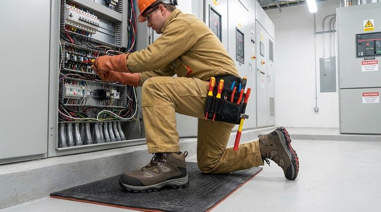La sicurezza elettrica è solo una parte della consapevolezza del cantiere. Una suola robusta con tasselli profondi è essenziale per mantenere la presa e prevenire scivolamenti, inciampi e cadute, che sono cause comuni di infortuni.